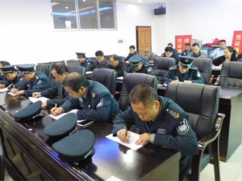 “保安員證”考試中,隊(duì)員正在聚精會(huì)神參加筆試
